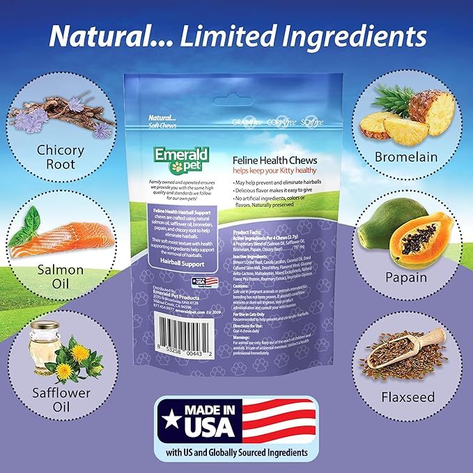 - NATURAL AND LIMITED INGREDIENTS THAT HELP CATS LIVE A HEALTHIER LIFE — Emerald Pet's feline hairball treatment supplements are made with natural and limited ingredients specializing in allergen concerns so cats can live a happy and healthy life with their pet owners. These soft hairball cat chews contain no sugars, salt, or by-products but still taste amazing. All Emerald Pet products are made right here in the USA with premium ingredients.