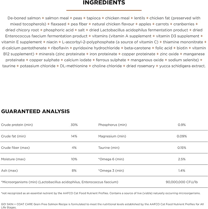 - DESIGNED FOR INDOOR CATS: Our GO! SOLUTIONS SKIN + COAT CARE Salmon Recipe is a premium-quality indoor cat food formulated with balanced proteins + fats to support a healthy weight.