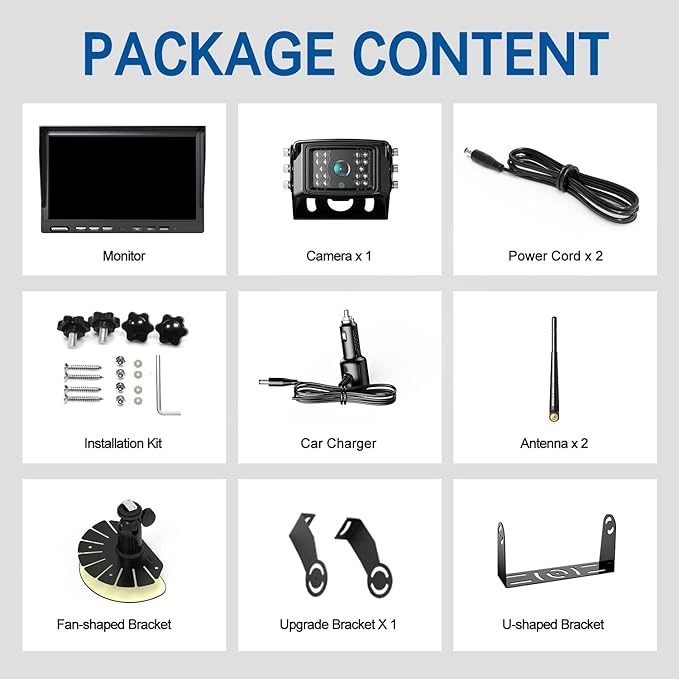 - Please note that the system transmits the camera image to the monitor via a wireless 2.4GHz signal. There is no cable between the camera and the monitor, but the camera and the monitor need power cord to get power and work, which saves yourself the trouble of charging and provide convenient and safe monitoring for your travels. Dimensions of monitor (without bracket): 9 21/25" wide * 6 21/50" tall * 1 1/10" thick;Dimensions of rear camera (without bracket): 2 19/20" wide * 2" tall * 1 13/20" thi