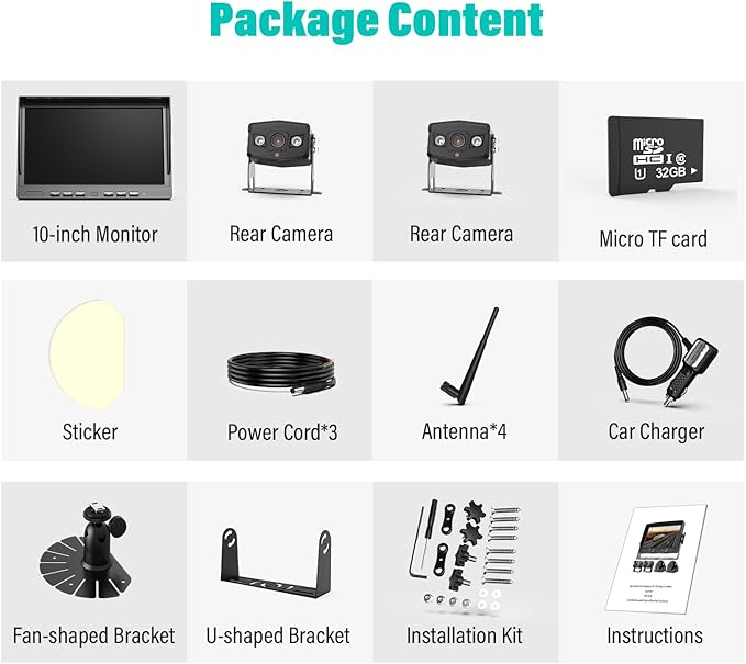 - šš Upgraded Wireless Signal System: This wireless back up camera system includes a 10 inch monitor and 2 wireless backup cameras. Adopts 2.4G wireless digital transmission and upgraded digital signal chip, it presents stable high-definition 1080P images/videos for reversing or monitoring.