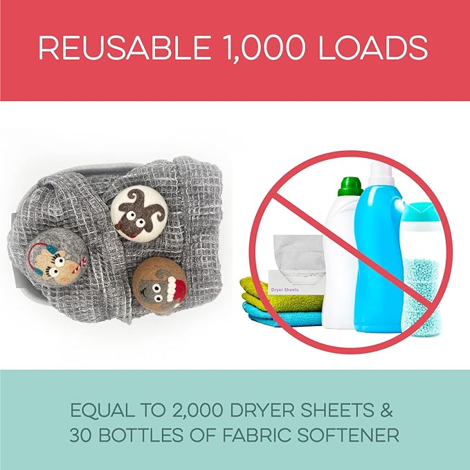 - REUSABLE FOR 1000+ LOADS β REDUCE WASTE: Why keep buying disposable dryer sheets? These cute dryer balls last 1000+ loads, replacing 2000 dryer sheets or 30 bottles of fabric softener. Fluff Ewes dryer wool balls laundry reusable deliver a cost-effective solution for 2-4 years of hassle-free laundry. Make a smarter choice for your wallet and the environment.