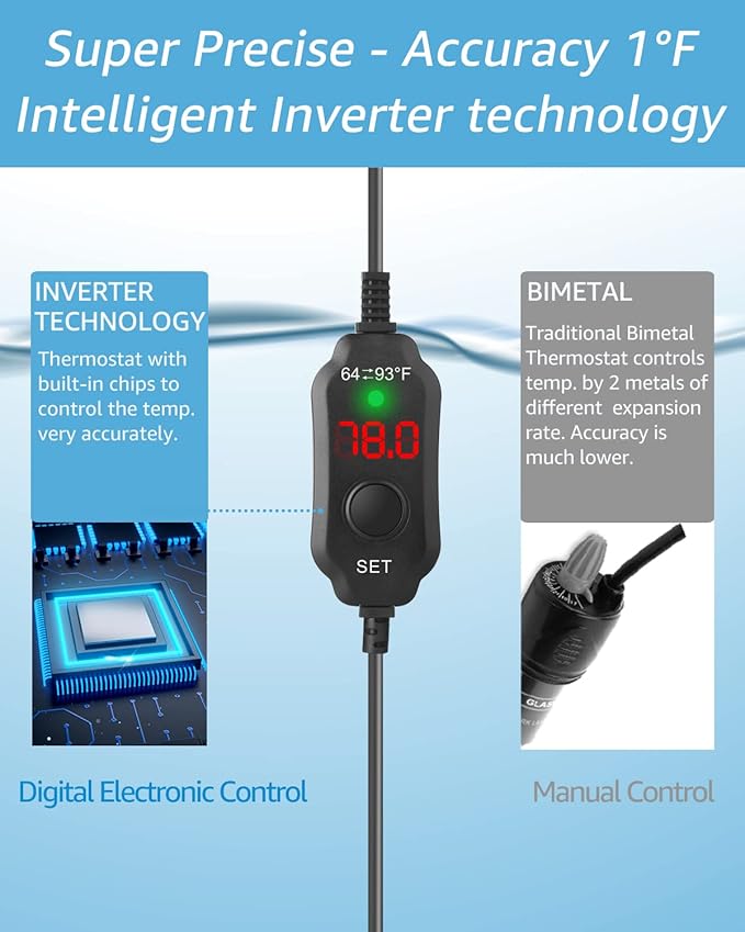 - SUPER ACCURATE 1℉ – Thanks to the intelligent inverter technology, with the in-built chips the thermostat keeps the fish heater at a constant temperature at an accuracy of 1℉, much more accurate than the traditional knob-controlled fish heaters and you save your electricity expenses by 50%!