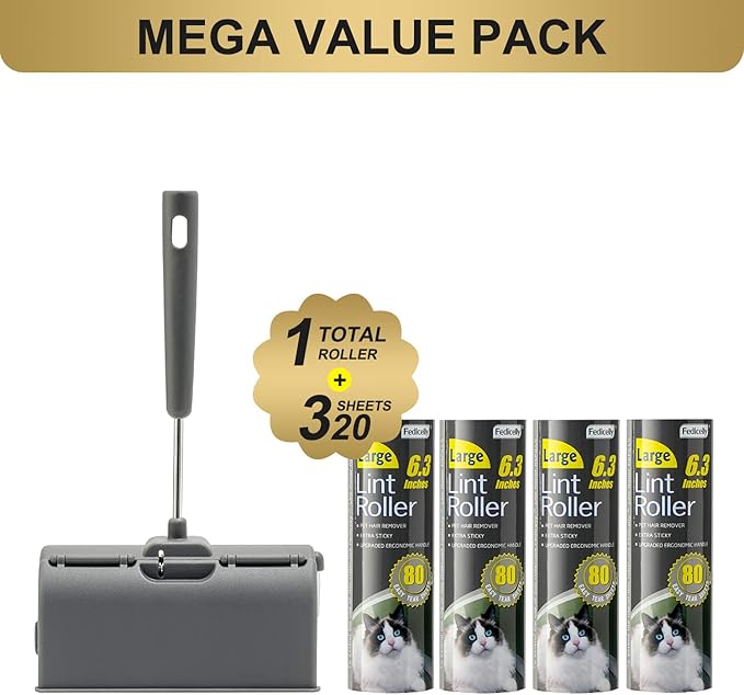 - MEGA VALUE SET 320 SHEETS: This large pet lint roller come with ergonomic handle and 4 lint roller refills, each large lint roller refill has 80 Sheets(6.3'' Wider) ,that means you’ll have a total of 320 sticky sheets in stock. Such economical value pack can be long lasting to meet your everyday clean needs. Better quality, higher cost performance.