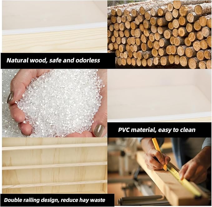 - 【Easy to Install and Clean】Safe wooden bunny feeder manager is easy to install, you can assemble it through the pre-drilled holes, and the removable plastic tray which helps you solve your cleaning time to a certain extent