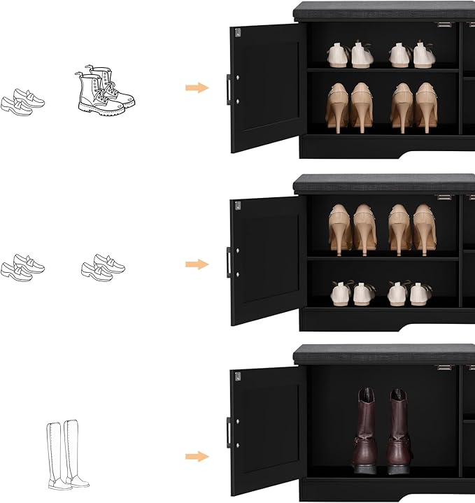 - Keep Your Shoes Organized: The depth of bench is 13.8 inches, which makes it easily to put in your shoes, meanwhile shoes of various heights can be placed by adjusting middle movable boards. The bench doors design ensures not only your privacy, but also a tidy space