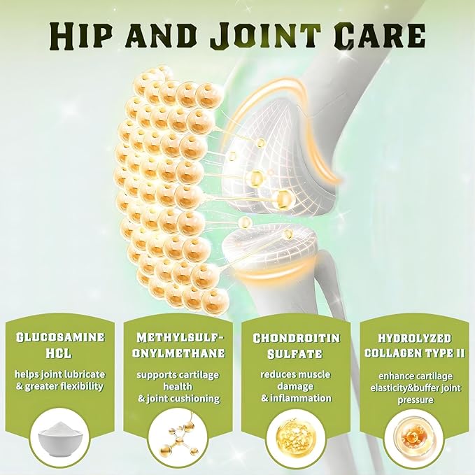 - Bone Health and Super Absorption: Our glucosamine chondroitin for dogs is rich in lactoferrin, magnesium and calcium, they has been proven to increase bone density and build bone structure, avoid reduced mobility and frequent fractures. In hip and joint supplement for dogs, adding magnesium and vitamin D directs calcium to where it should goβBONES, which means they improve calcium absorption and bioavailability. Vitamin C can help the synthesis of collagen and provide nutrition to the cartilage.