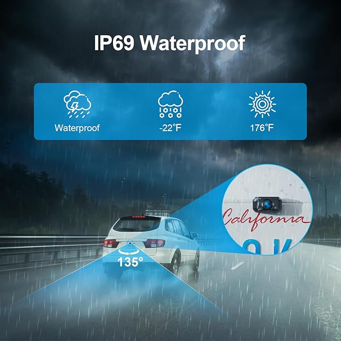 - IP69 Waterproof Liscent Plate Camera: The housing of license plate camera is made of ABS+PC metal raw material. Featuring with IP69 waterproof rating, it is more heat resistant and less likely to bend or break, which is able to work perfectly and provide clear images in extreme environments from -22°F to 176°F. It can tenaciously resist the baptism of wind, rain, dust, enhancing the safety index and service life