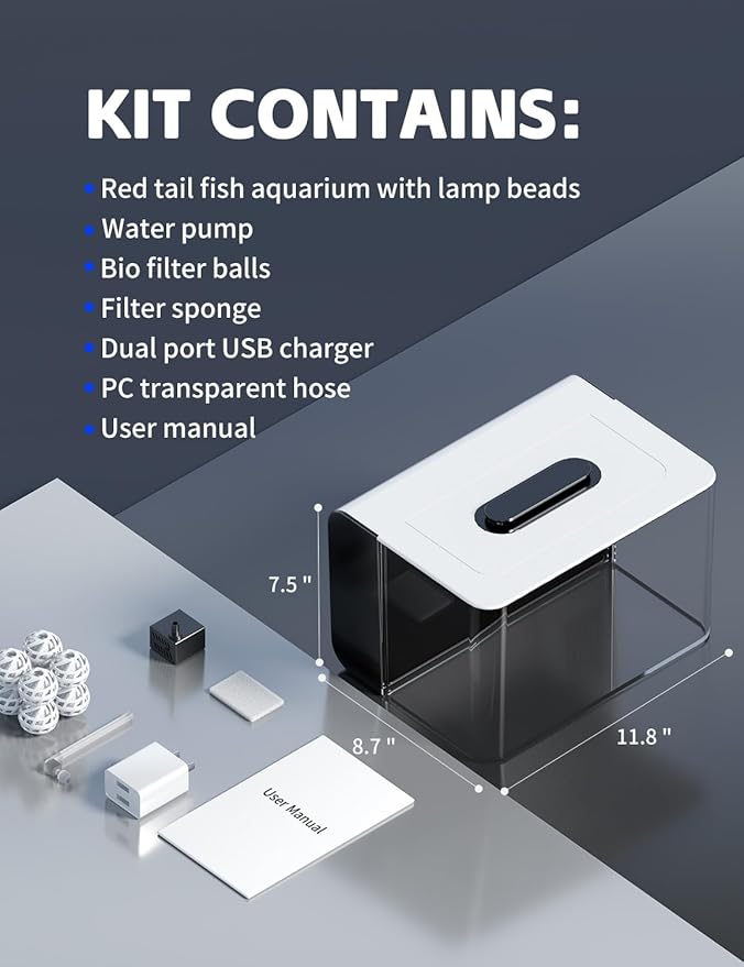 - [Fish Tank Starter Kit] A 2.5 gallon fish tank with detachable lid and LED light, a quiet water pump, a package of filter sponge(for 6 months), 8 bio filter balls, a dual-port USB charger, a PC transparent hose, and a user manual. Friendly to beginners