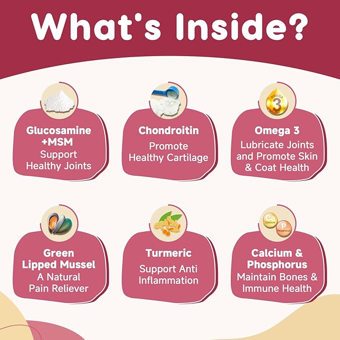 - Premium Joint Support: Our hip and joint supplement dogs contains glucosamine chondroitin for dogs to support healthy joints and cartilage, keep connective tissues resiliency, and MSM reduces joint discomfort caused by inflammation and support flexibility