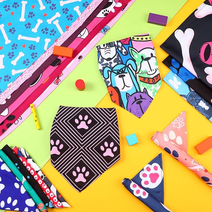 - Colorful Dog Bandana: our pet bandanas for dog are featured with bright and vibrant colors, such as blue, red, pink, yellow, purple, green and more, printed on different pattern designs of paw and bone, eye catching and attractive, full of holiday atmosphere, a wonderful bandanas for your dogs, which can make your pup rock a trendy and adorable look for holiday and beyond
