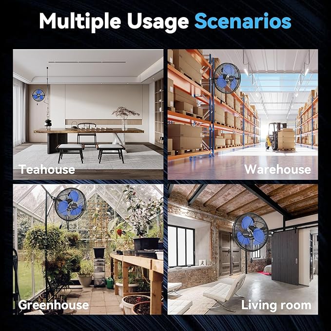 - ššØš°-ššØš¢š¬š ššš¬š¢š š§ - The black heavy-duty wall fan operates at a high speed of 9500 CFM with a noise level of only 65dB, which is lower than the industry standard, creating a quieter gathering or working environment