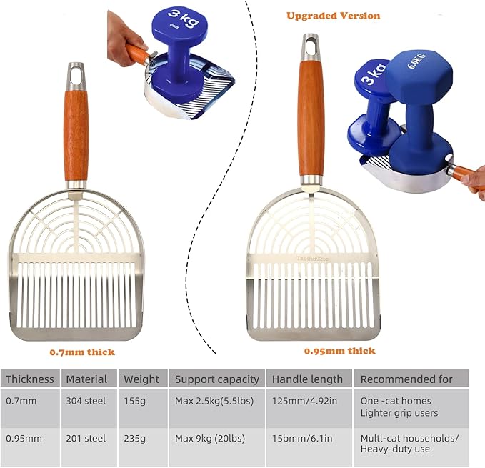 - [Upgraded to 0.95mm Thick ] This is a TabifurKitc custom-built heavy duty metal cat litter scoop, upgraded from 0.7mm to 0.95mm in thickness. Made from 201 stainless steel, this durable poop scooper supports up to 9kg (20 lbs) of clumping litter. Reinforced welds eliminate cracking or snapping, making it perfect for multi-cat households or anyone needing a litter box scooper that handles weight with ease.
