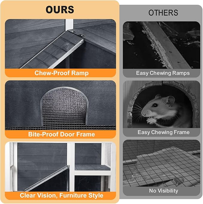 - Smart Ventilation & Easy Access: Metal mesh ensures excellent airflow while locking side doors on both ends make cleaning and feeding simple. A deep pull-out tray collects waste, reducing odor and cleanup time.