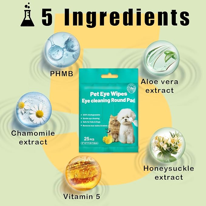 - Hypoallergenic & Naturally Soothing​ - Our pet eye wipes are infused with aloe vera, chamomile, and honeysuckle extracts to effectively combat eye irritation, remove tear stains and crusts, while neutralizing odors. Free from alcohol, dyes, and harsh chemicals, these gentle wipes are safe for all dogs' delicate eye and facial areas.