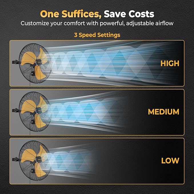 - High-Efficiency Ventilation: 30ft airflow (50% farther than others) and 360° rotation ensure no ventilation dead zones. This 3-speeds wall mounted fan adapts to diverse scenarios, balancing airflow and energy consumption. The aerodynamic blade design enhances efficiency, making it a good choice for garage fans, greenhouse fans, and workshop cooling.